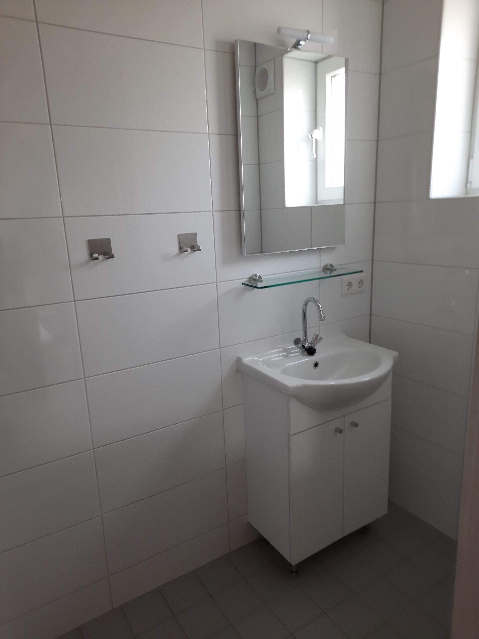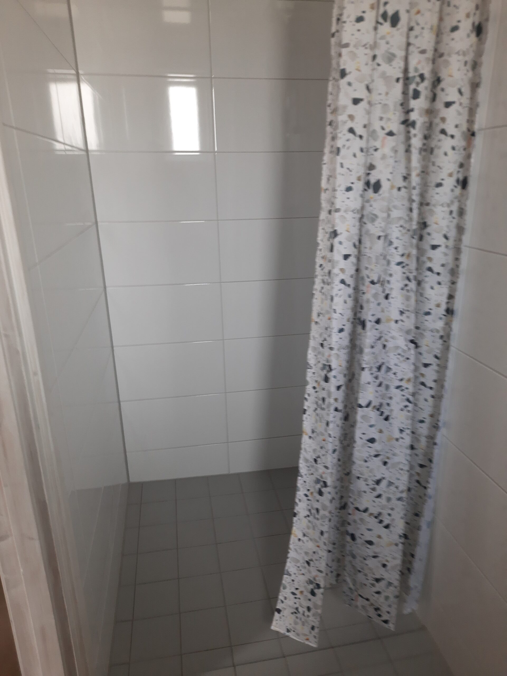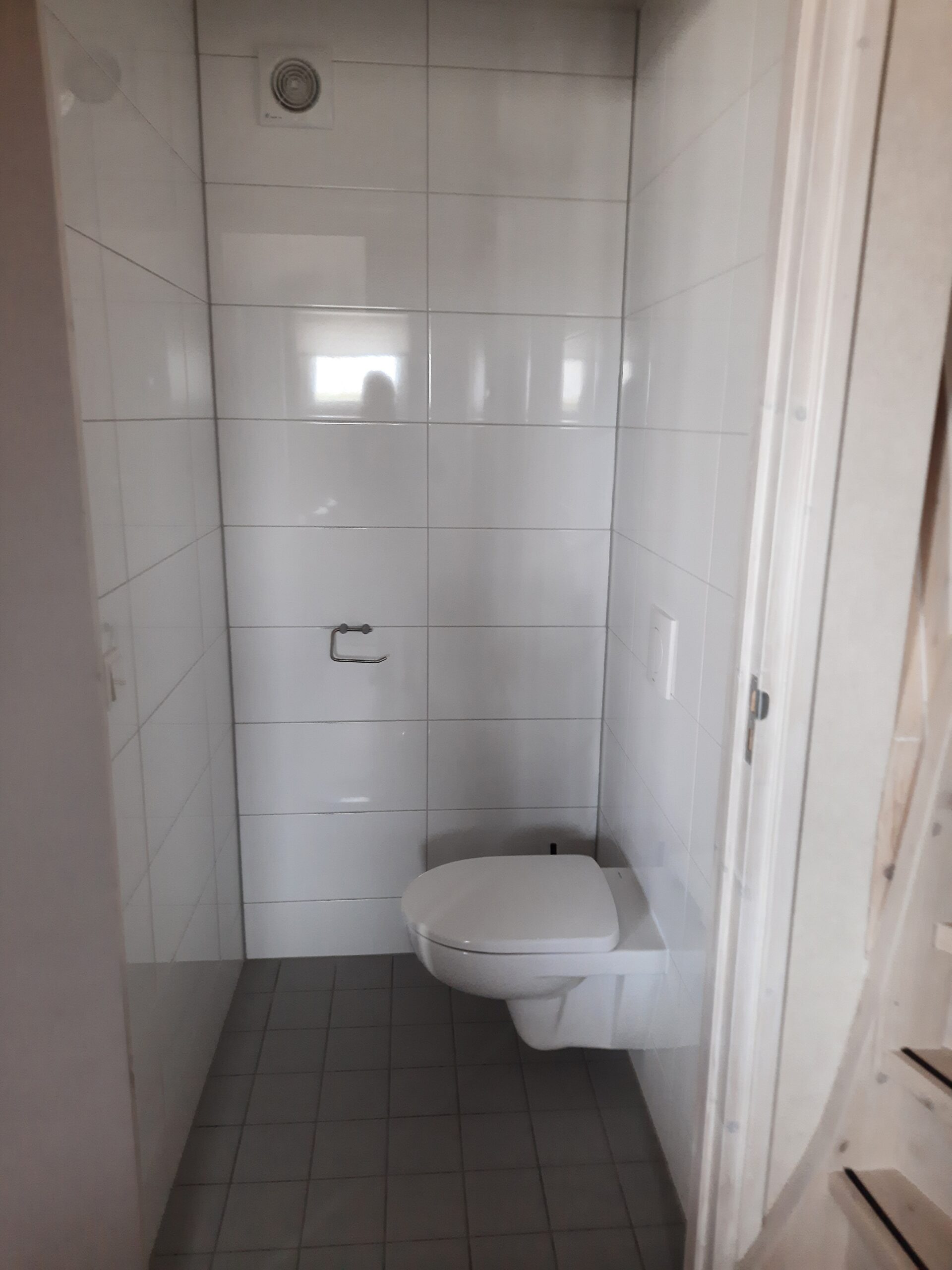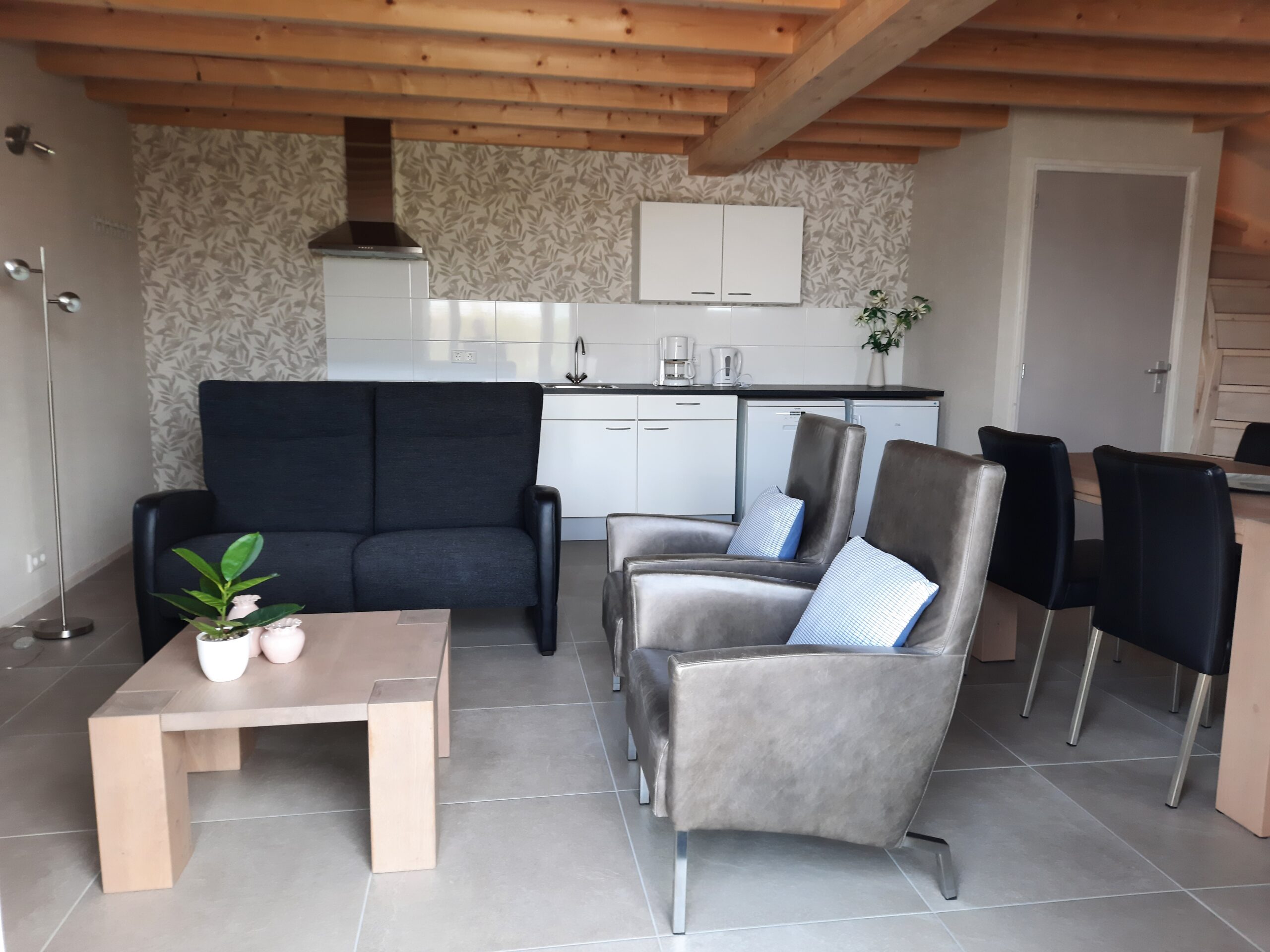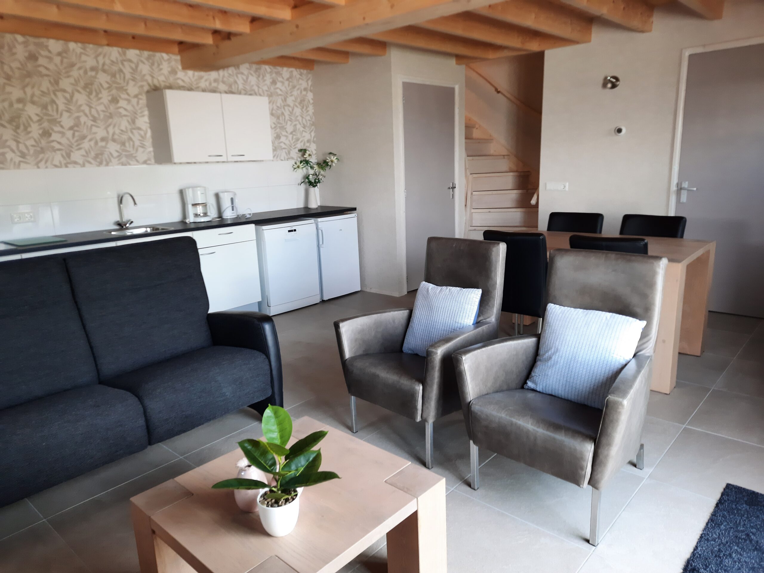 Beneden is de leefruimte met zithoek, eethoek  en keuken, badkamer en een apart toilet.